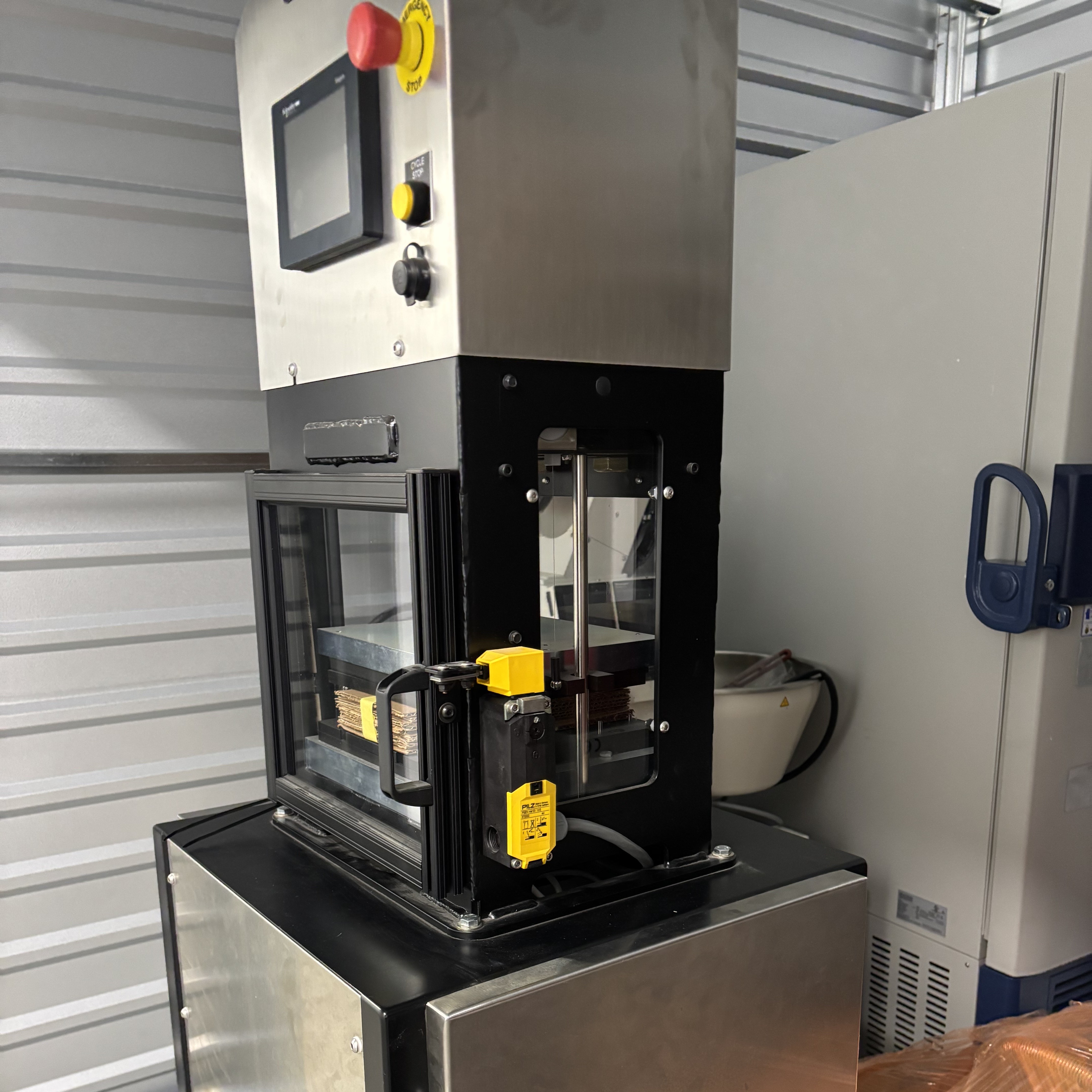 Automatic control with the ability to adjust between 1 and 30 tons of force in half-ton increments. Auto-locking safety door interlock and impact-resistant windows protect operators. Machine enclosure rests on casters with leveling feet for easy, safe maneuvering and securing. Very low maintenance system. Food grade hydraulic oil and stainless enclosure ensure easy cleaning and system management. The 120VAC hydraulics require no compressed air system.